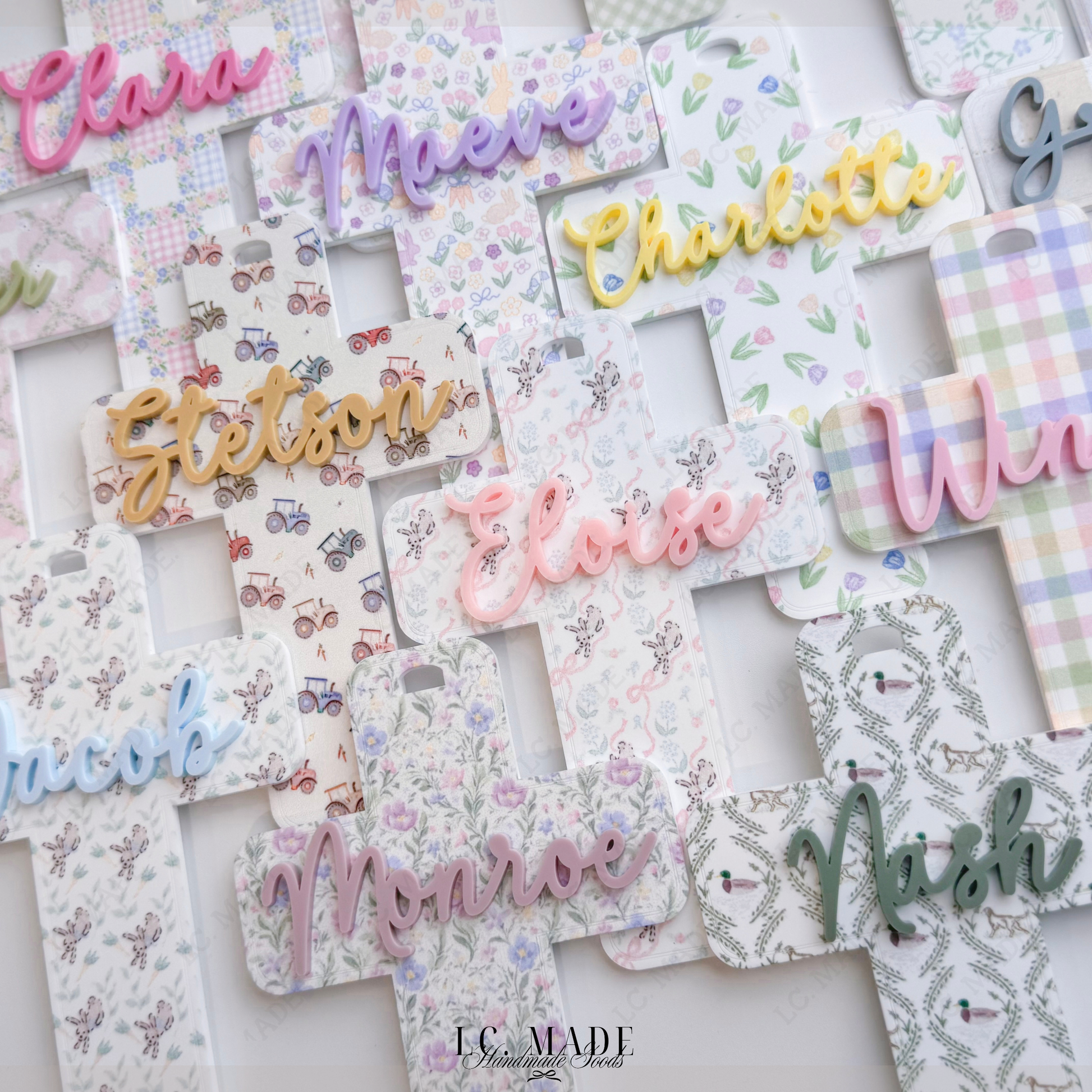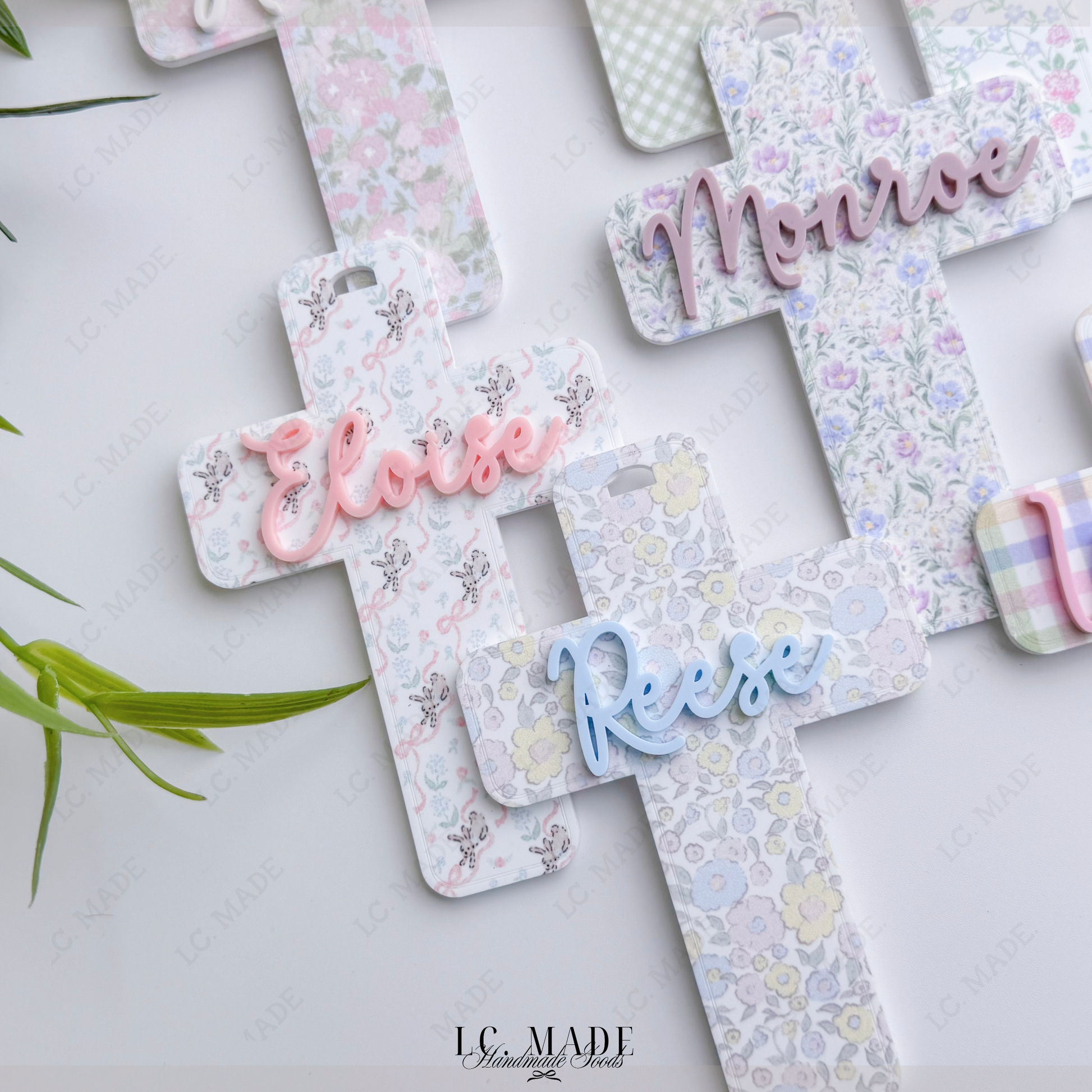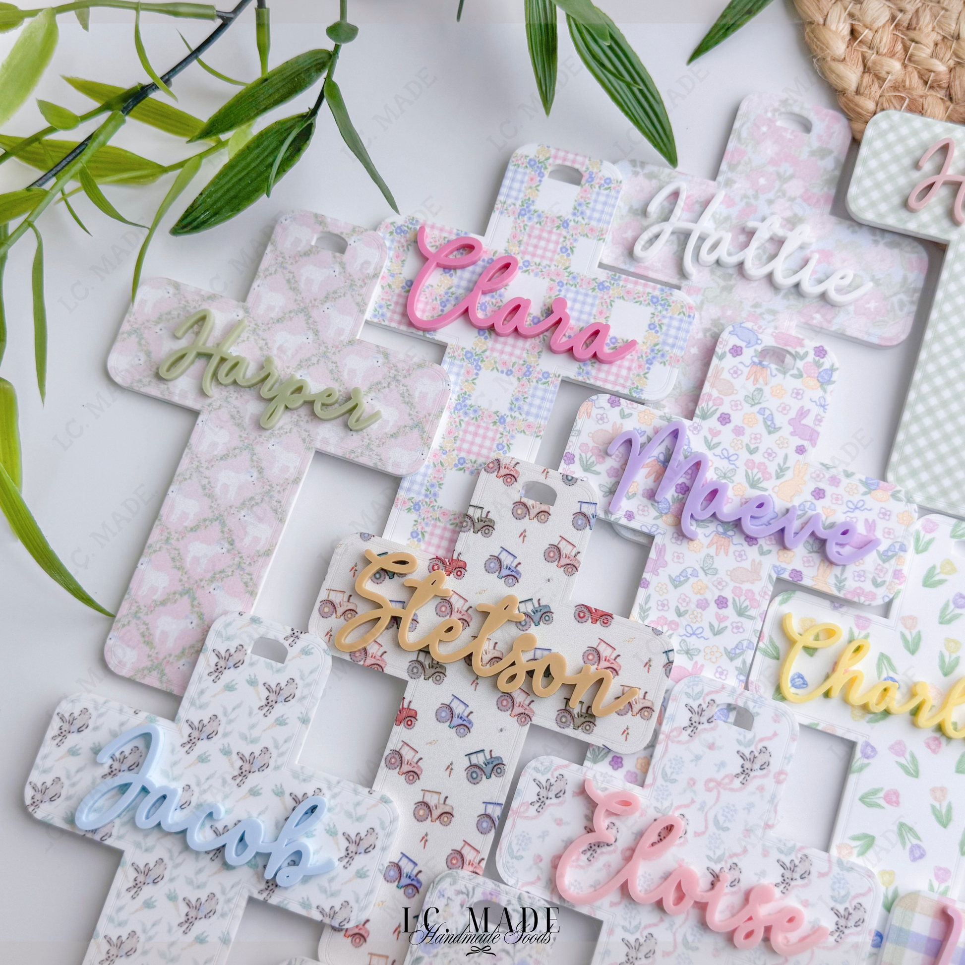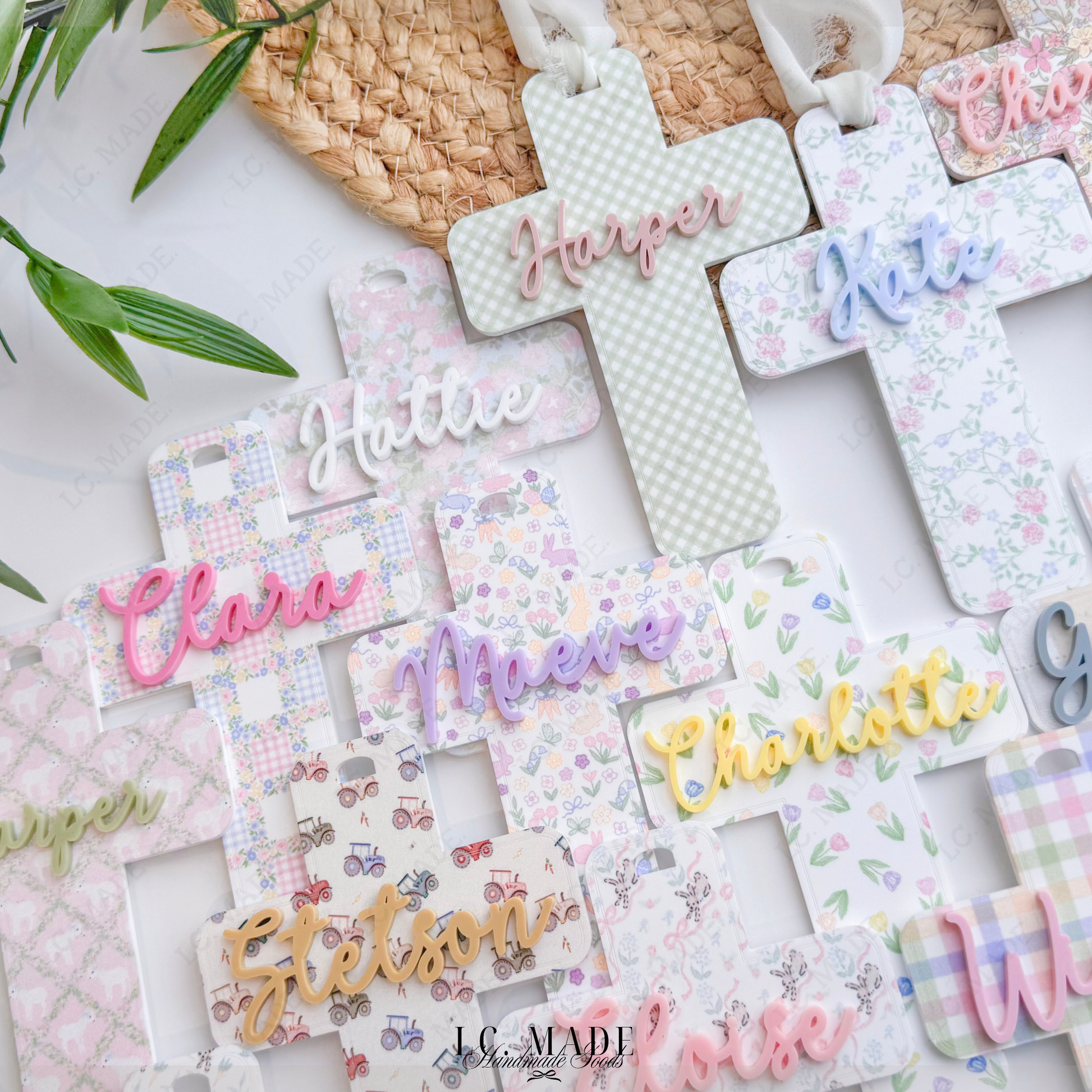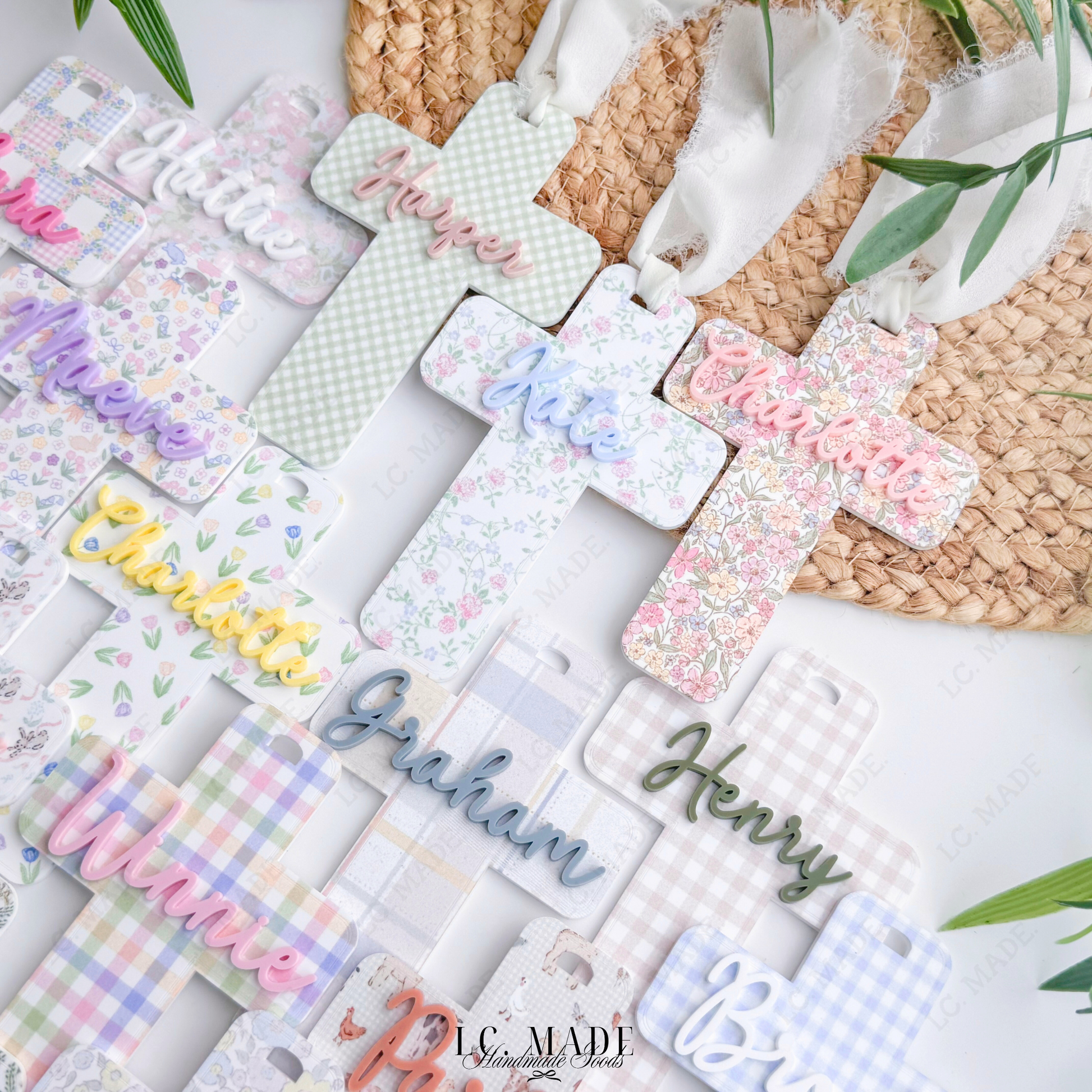 Each cross is crafted from premium 1/8â permanently printed acrylic, featuring delicate, spring-inspired patterns and layered with your childâs name in raised acrylic for a beautiful dimensional finish. Thoughtfully sized to stand out on Easter baskets, this piece makes a meaningful addition to family traditions and a keepsake youâll reach for every spring. Finished with an ivory chiffon ribbon, it ties effortlessly onto baskets, gifts, or hooks for display.