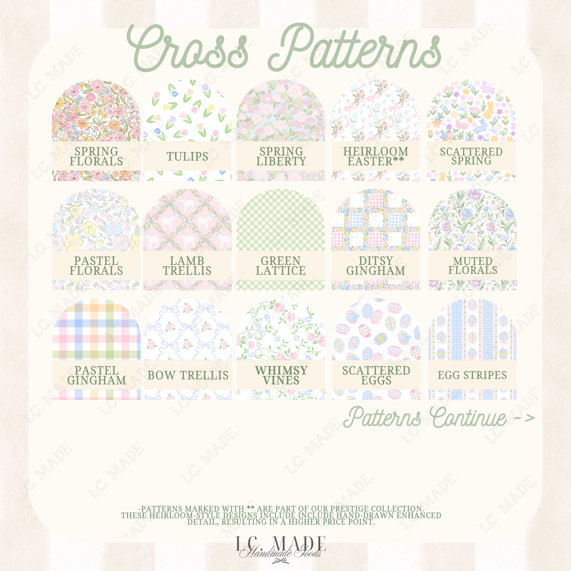 ** indicates a Prestige Pattern featuring a specific artwork and elevated detail, and is priced accordingly.